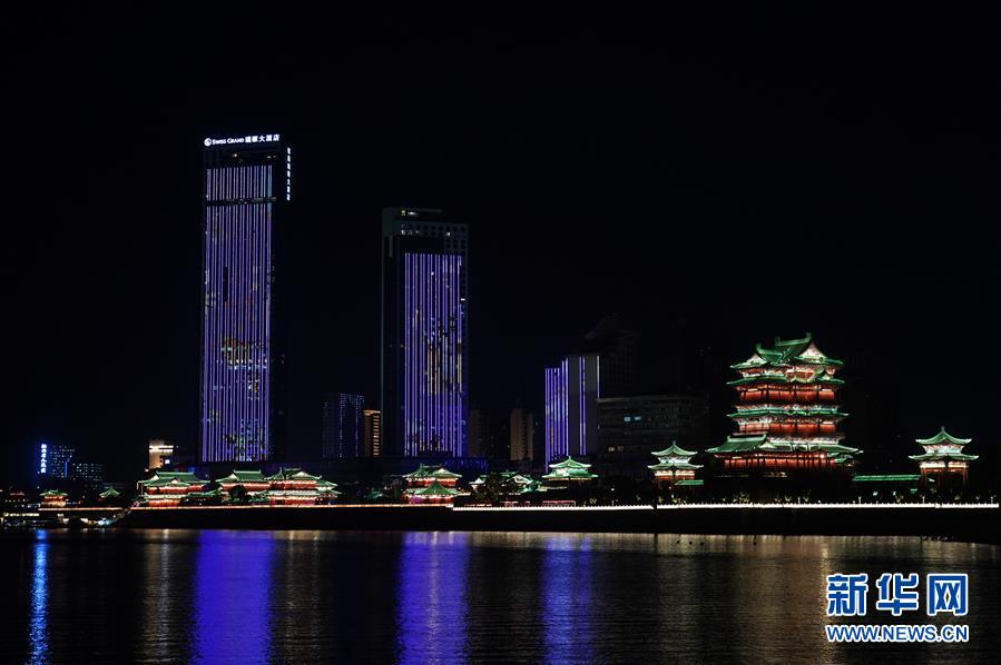 这是江西南昌赣江畔上演的灯光秀(8月6日摄)。 夏季,江西南昌市赣江畔高楼灯光璀璨,五光十色的灯光组成了壮观的灯光秀,吸引了大批游客。据介绍,近年来,南昌为发展“夜经济”,着力打造夜游项目,夜游项目以滕王阁为核心,借助赣江两岸景观照明,结合同步音效,打造立体、动态、富有江西元素的风景,让游客感受夜景的美丽和江西的历史文化。 新华社记者周密 摄