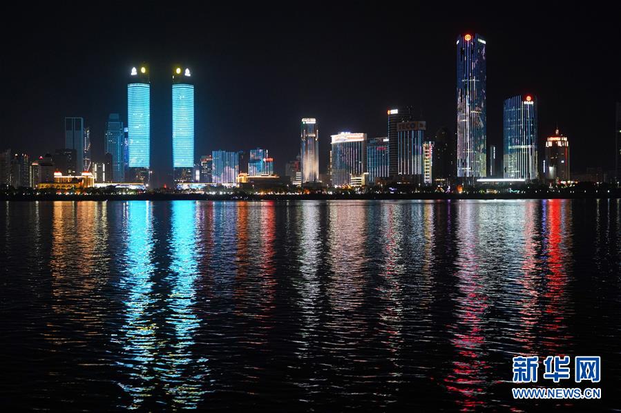 这是江西南昌赣江畔上演的灯光秀(8月6日摄)。 夏季,江西南昌市赣江畔高楼灯光璀璨,五光十色的灯光组成了壮观的灯光秀,吸引了大批游客。据介绍,近年来,南昌为发展“夜经济”,着力打造夜游项目,夜游项目以滕王阁为核心,借助赣江两岸景观照明,结合同步音效,打造立体、动态、富有江西元素的风景,让游客感受夜景的美丽和江西的历史文化。 新华社记者周密 摄