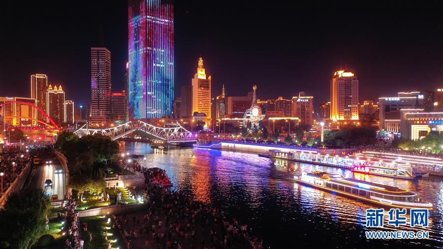 天津解放桥在夜色中开启桥面,周边灯火璀璨引万人围观(7月1日摄)。新华社记者李然摄