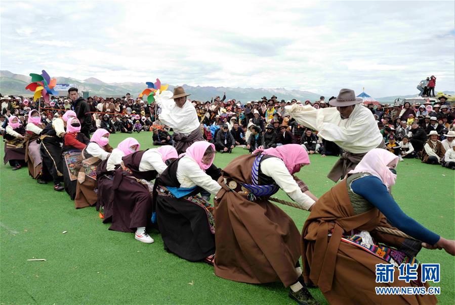 8月9日,西藏当雄县举行竞争激烈的民间传统拔河比赛。 当天,西藏当雄县海拔4300米的赛马场举行激烈的民间传统拔河比赛,来自当雄县各乡镇的牧民妇女盛装参加拔河比赛,场面喜庆而热闹。 新华社记者 王益亮 摄