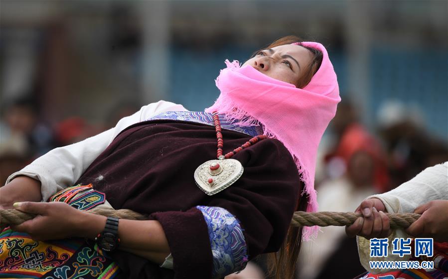 8月9日,西藏当雄县举行竞争激烈的民间传统拔河比赛。 当天,西藏当雄县海拔4300米的赛马场举行激烈的民间传统拔河比赛,来自当雄县各乡镇的牧民妇女盛装参加拔河比赛,场面喜庆而热闹。 新华社记者 连漪 摄