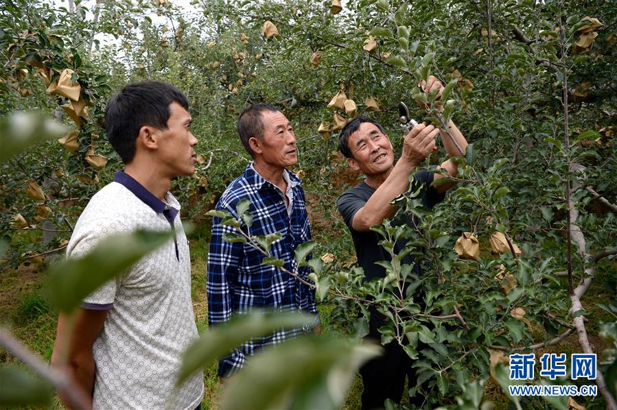 陕西延安宜川县辛户村村支书张延刚(右一)和村民一起查看苹果生长情况(8月3日摄)。新华社记者 刘潇 摄