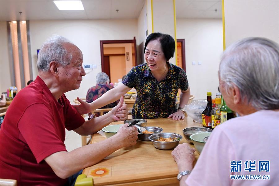 福州市鼓楼区东街街道军门社区党委书记林丹(中)在社区居家养老服务照料中心与就餐老人刘建国(左)和他的老伴打招呼(7月30日摄)。 新华社记者 林善传 摄