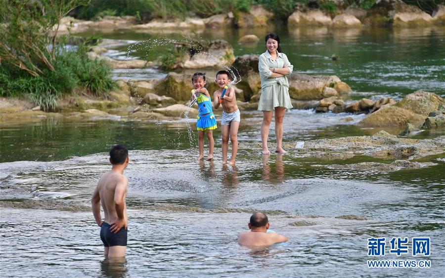 在广西鹿寨县中渡古镇响水瀑布景区,游客在响水河里戏水消暑(8月9日摄)。 近年来,广西鹿寨县立足乡村资源特色和生态环境优势,加大资金投入力度,加强旅游资源的保护和开发,提升乡村旅游品质,打造“祥荷乡韵”“山楂之恋”“稻花香里”等一批乡村旅游景点,引导贫困地区群众在参与发展旅游产业中实现就业、增加收入、稳定脱贫。据了解,目前全县旅游从业人员已达1.6万人。2016年以来,乡村旅游产业带动全县1300多名贫困人口实现脱贫。 新华社记者 黄孝邦 摄
