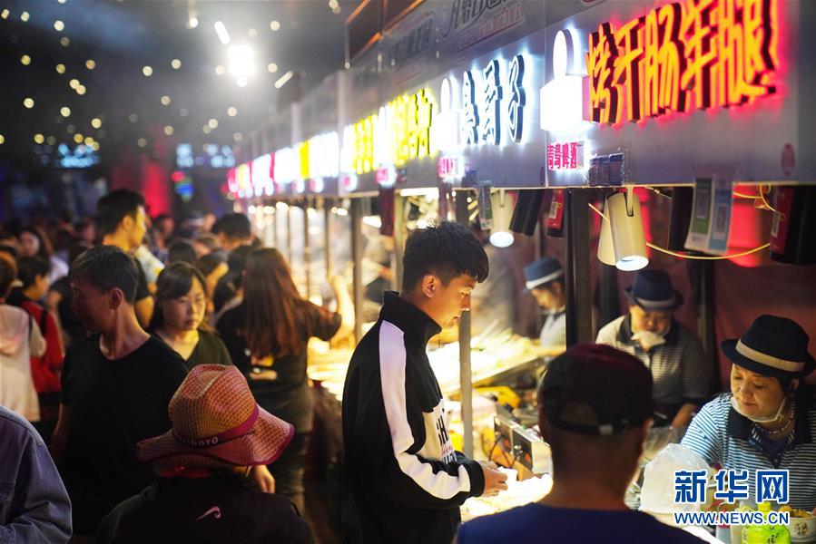 夜色笼罩下,百年老街中央大街美食区人头攒动(8月9日摄)。时下,冰城哈尔滨市正值旅游旺季。夜幕下的哈尔滨别有韵味,人们在夜色中感受清爽江风,欣赏欧式建筑,品尝冰城小吃,在清凉惬意中“品味”夜冰城的豪爽与妩媚。 新华社记者王建威摄