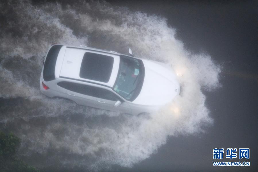 8月10日,车辆在宁波市北仑区积水路段前行。 今年第9号台风“利奇马”已于8月10日1时45分前后在浙江省温岭市城南镇登陆,登陆时强度为超强台风级,中心附近最大风力16级,相当于52米/秒,中心最低气压930百帕。“利奇马”登陆后,浙江大部分地区有大雨暴雨,浙东沿海局部地区有特大暴雨。 新华社记者翁忻旸摄