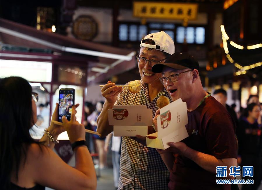 游客在上海豫园夜市拍照留念(6月4日摄)。新华社记者刘颖摄
