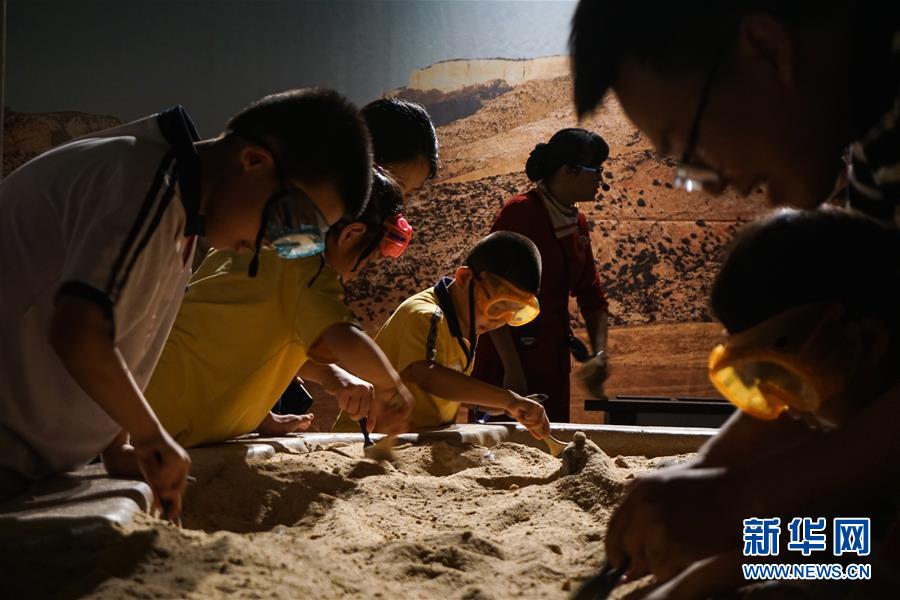 观众在广东科学中心举办的恐龙科学之夜参加体验活动(5月24日摄)。 新华社记者刘大伟摄