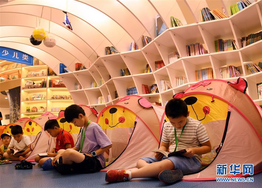 参加青岛栈桥书店夜宿活动的小读者在睡前读书会上阅读(7月24日摄)。新华社记者 李紫恒 摄