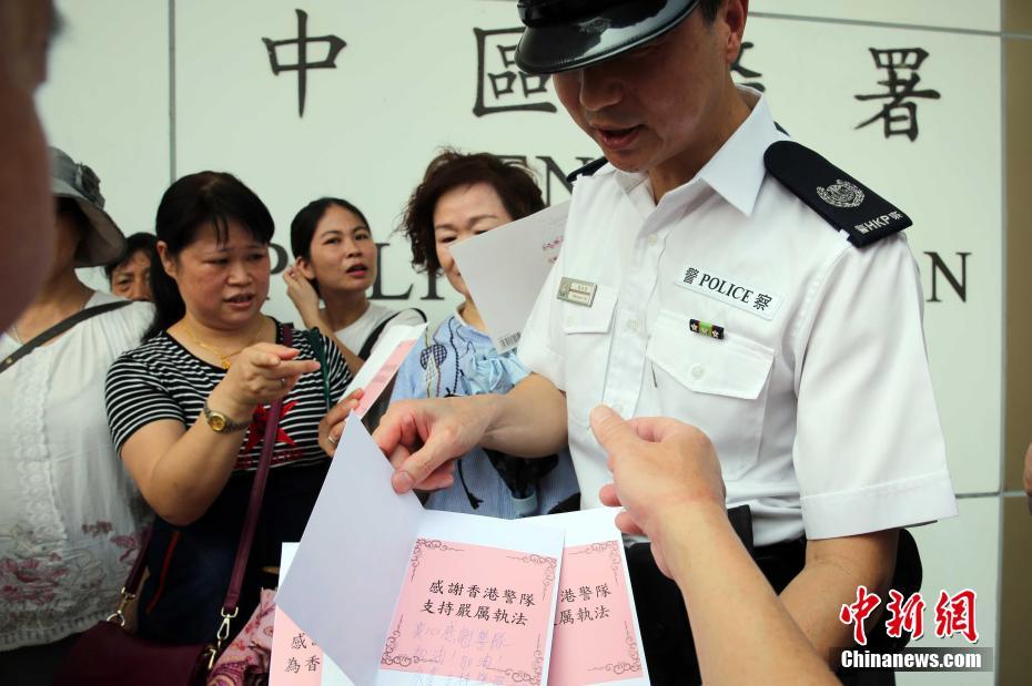 8月10日,“守护香港大联盟”当天在香港各区发起“全民撑警日”活动,呼吁市民携同亲友前往附近警署,向警队送上心意卡或慰问信,向警务人员表达慰问和支持。图为市民将慰问卡及签发递交中区警署值日警官。中新社记者 洪少葵 摄