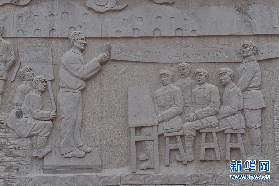 位于陕西志丹县城的中国人民抗日红军大学旧址院内墙壁浮雕上,有一部分显示的是美国记者埃德加·斯诺在给中国人民抗日红军大学学员讲课的情景(8月8日摄)。 新华社记者 罗晓光 摄