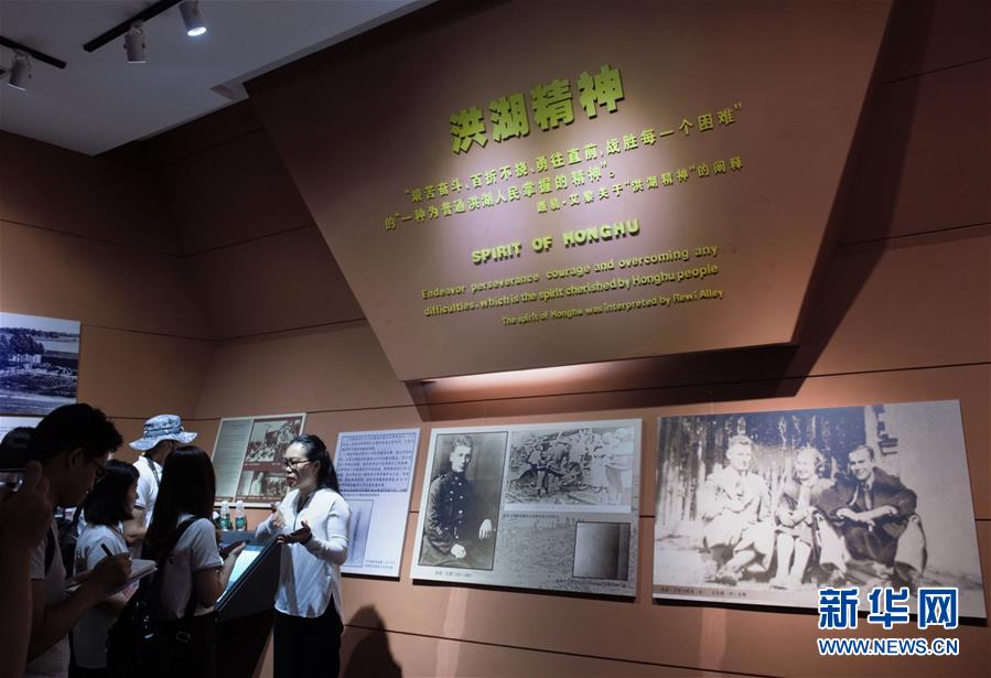 湖北省洪湖市档案馆副馆长廖雪琴(右一)在湘鄂西苏区革命烈士纪念园向记者介绍路易·艾黎总结的“洪湖精神”(8月3日摄)。 新华社记者 罗晓光 摄