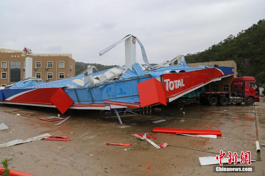 2019年8月10日凌晨4时许,浙江温岭城南镇一加油站一千平方的遮雨棚被台风吹塌,所幸除了两辆避风的货车被压车上货物有损外,并无任何人员受伤,据加油站负责人透露,此次事件至少损失一百多万。目前,加油站已经联系相关对坍塌的遮雨棚棚进行拆除。中新社发 金云国 摄