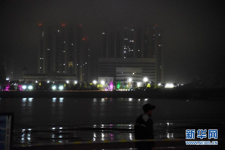 8月11日晚,一名安保人员在青岛市黄岛区海滨步行道执勤。新华社记者 王凯 摄