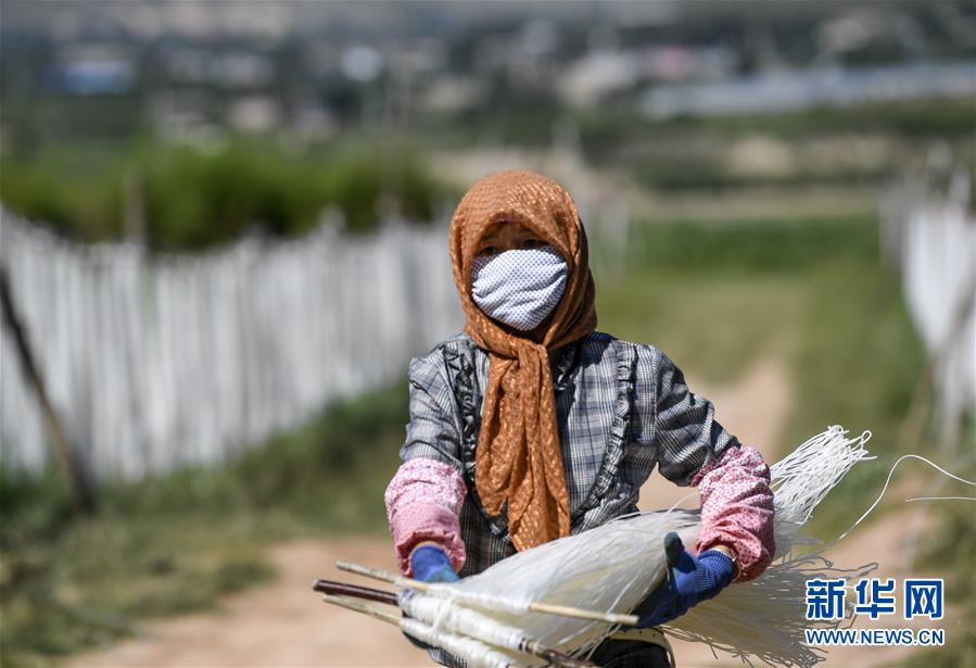 8月11日,宁夏西吉县兴隆镇王河村村民将已经晾晒好的“红军粉”取下装运。新华社记者 冯开华 摄