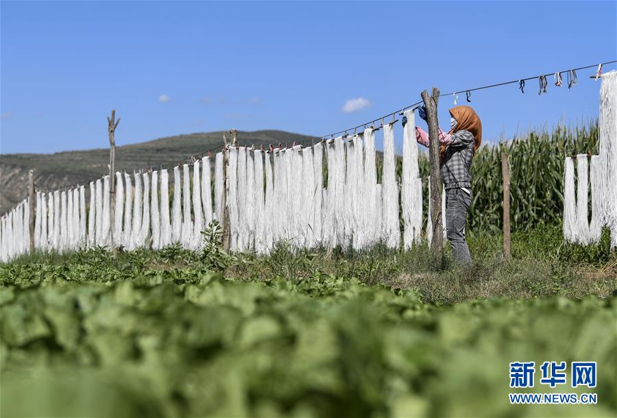 8月11日,宁夏西吉县兴隆镇王河村村民收取已经晾晒好的“红军粉”。新华社记者 冯开华 摄