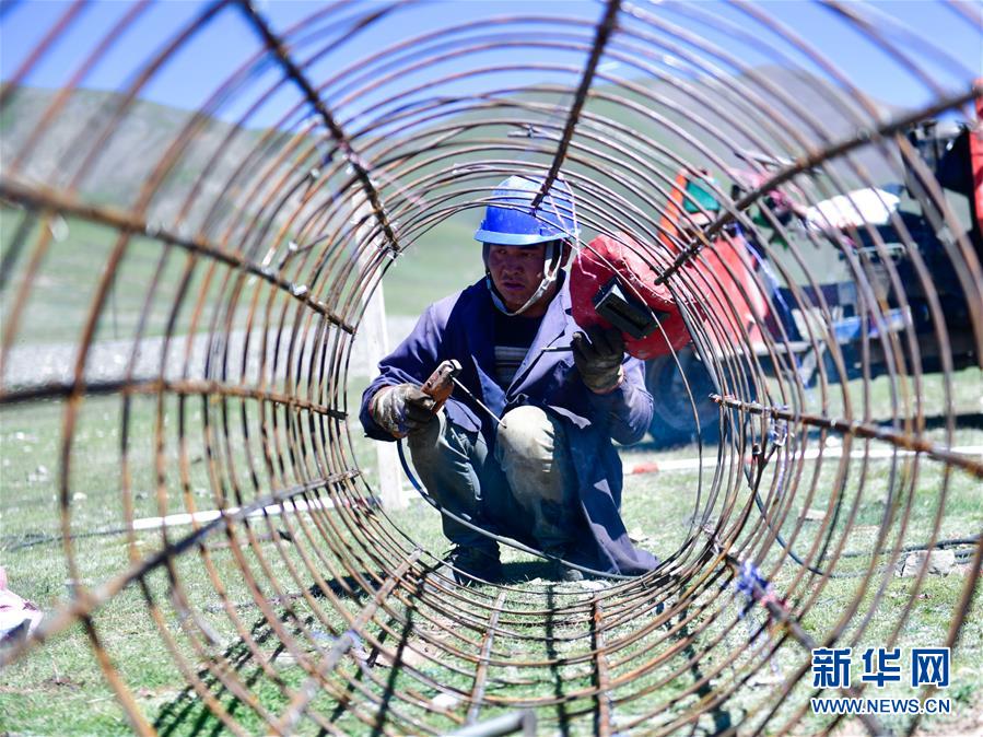8月9日,在青海省玉树藏族自治州治多县治渠乡境内的一处海拔4200余米的电网建设工地上,工人肖成文准备焊接钢筋笼。新华社记者 张龙 摄