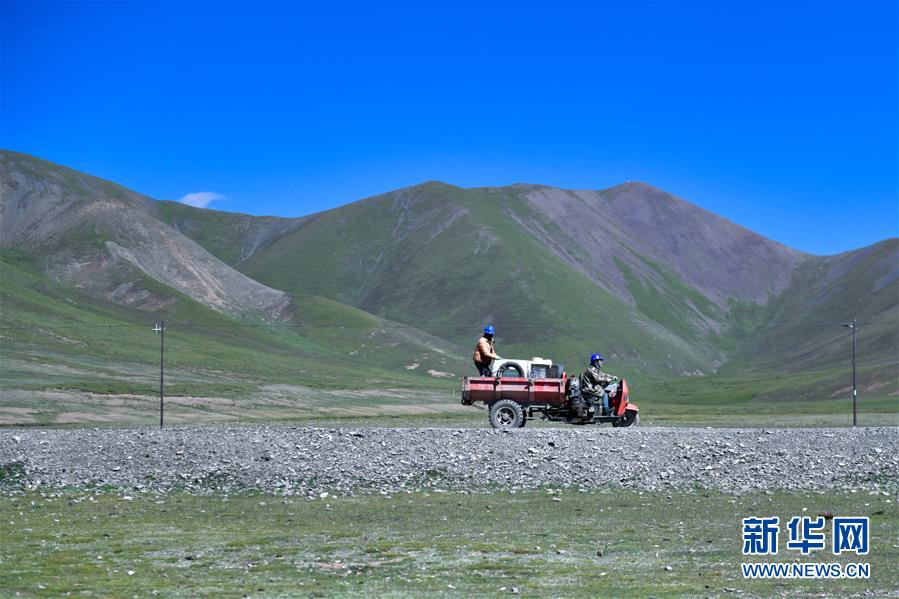 8月9日,在青海省玉树藏族自治州治多县治渠乡境内的一处海拔4200余米的电网建设工地上,工人从远处运送用于混凝土搅拌的水。新华社记者 张龙 摄