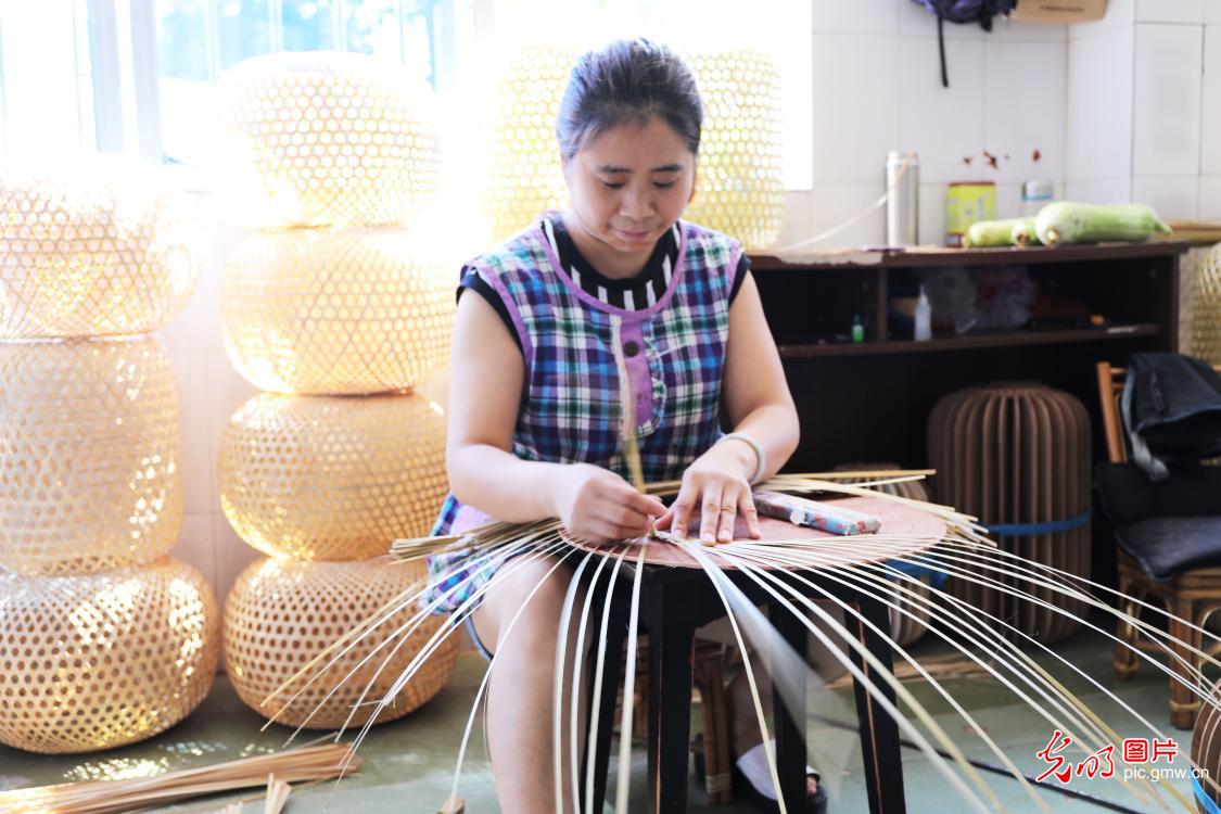 2019年8月11日,梁平区屏锦镇新桥社区的编织车间,工人在用竹条编织仿古灯笼。重庆市梁平区积极践行"生态优先绿色发展"理念,以绿色产业推动当地经济转型发展,实现了生态、经济"双丰收"。(刘辉摄/光明图片)