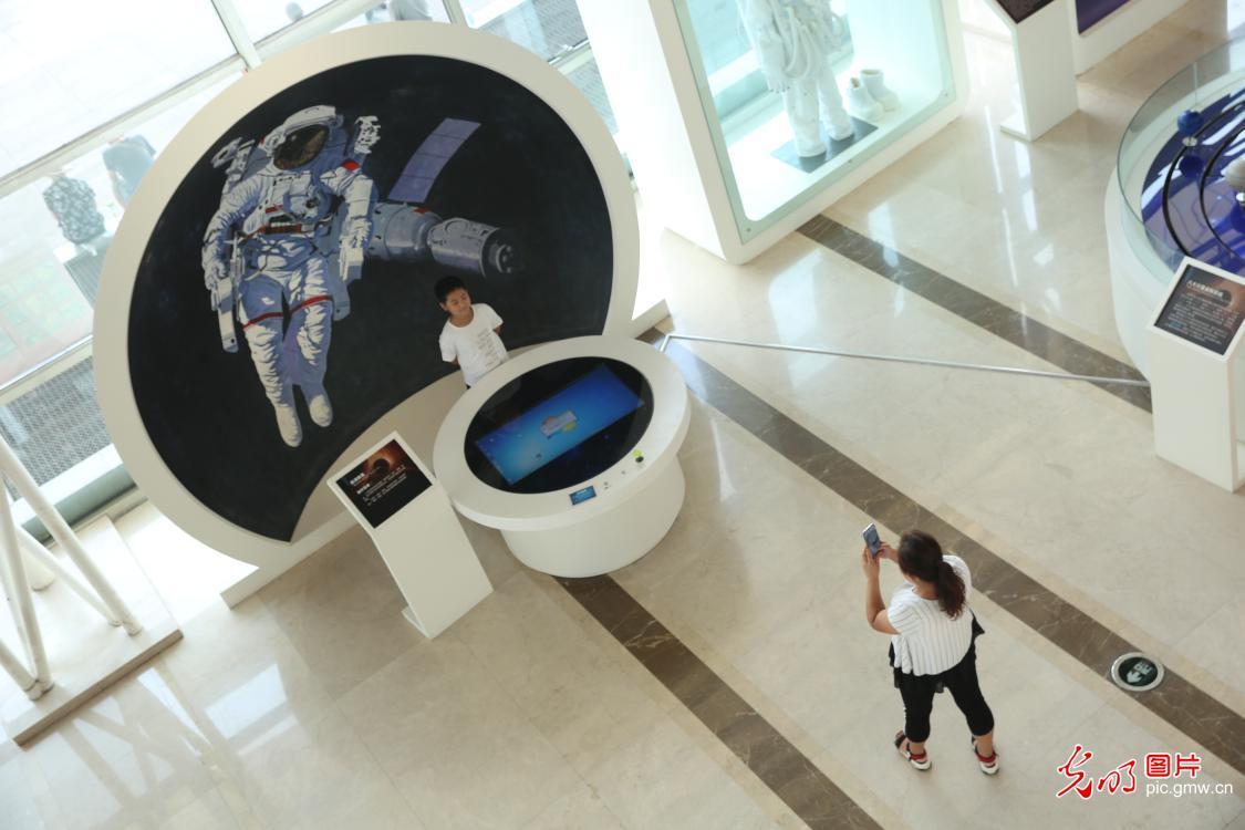 2019年8月11日,在河南省三门峡科技馆,小朋友在"黑洞吸盘"展品前留影。暑假期间,许多小朋友在家长的陪伴下来到三门峡科技馆,学习科学知识,体验科技魅力,在快乐中度过暑假。(王建栋摄/光明图片)