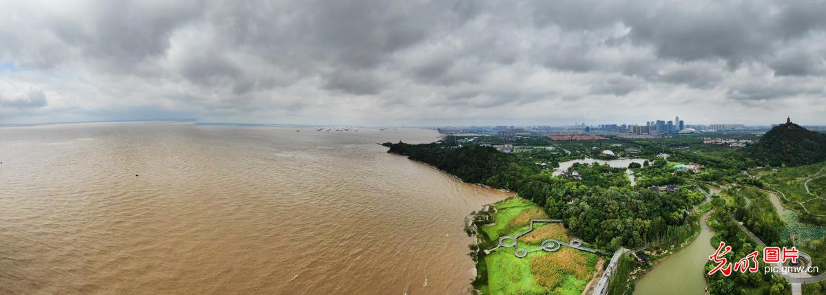 2019年8月11日,无人机航拍长江下游南通段狼山森林公园的画面。当日9时40分,江苏省南通市气象台变更台风黄色预警信号,受台风"利奇马"影响,预计未来24小时南通陆上和沿江最大风力可达7~8级,沿海阵风9~10级。(许丛军摄/光明图片)