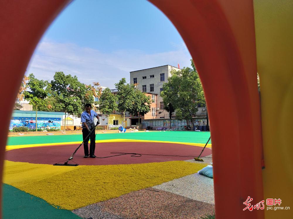 2019年8月10日,湖北省孝感市,工人在云梦县实验幼儿园冒着高温铺设塑胶运动场地。暑假期间,正是维修建设学校、幼儿园运动场地等的好时机。连日来的高温,师傅们在酷暑下铺设彩色塑胶运动场,为幼儿园如期开学做好准备。(陈保忠摄/光明图片)