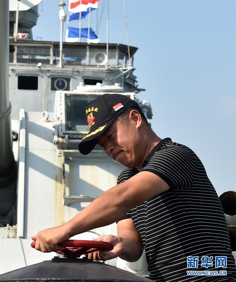 杨双峰在原163号南昌舰上检修维护设备(8月8日摄)。 新华社发(郝源 摄)