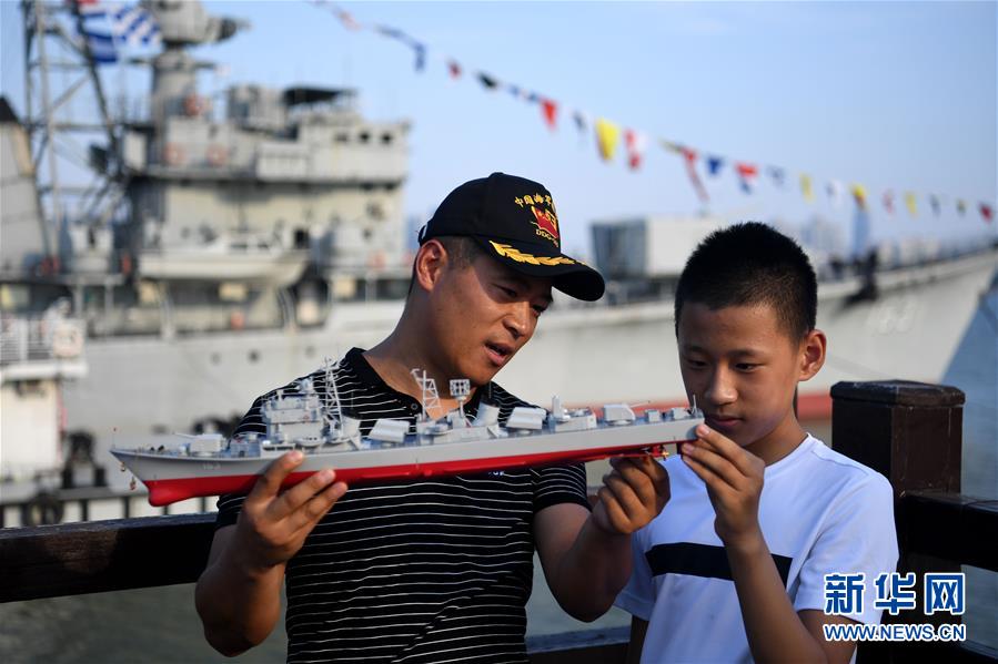 杨双峰拿着原163号南昌舰模型为儿子讲解(8月8日摄)。 新华社记者 刘军喜 摄
