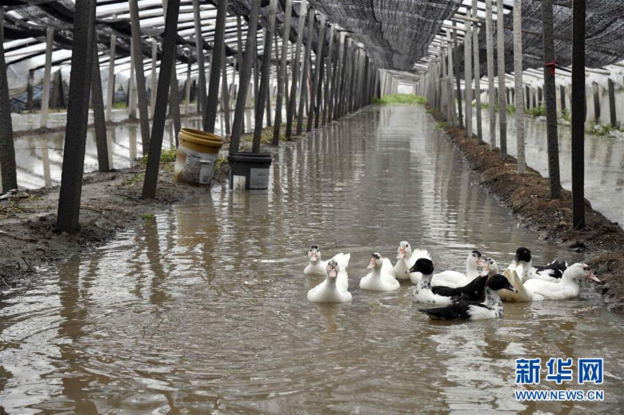 8月11日,在寿光市稻田镇东里村,蔬菜大棚进水,鸭子在水中游弋。 受台风“利奇马”影响,“蔬菜之乡”山东寿光遭遇自1959年有气象记录以来最大一次降水。据寿光市防汛抗旱指挥部8月11日消息,寿光市低洼易涝区1.8万个大棚进水,农田受灾面积13万亩,沿河部分村庄9.3万群众撤离。 新华社记者 郭绪雷 摄