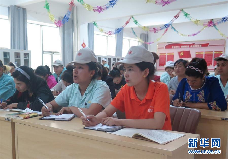 麦尔哈巴(前排右一)在参加纺织厂夜校业务技能培训(5月18日摄)。 借助产业援疆的“春风雨露”,新疆喀什地区疏勒县贫困女青年麦尔哈巴·乌拉伊木通过自学国家通用语言、钻研纺织技术,从一名普通纺织工成长为企业管理人员,在党的政策和援疆企业帮助下,2018年底实现了全家脱贫。如今,自强不息的麦尔哈巴已成为家乡年轻人争相学习的榜样。 新华社记者刘兵摄