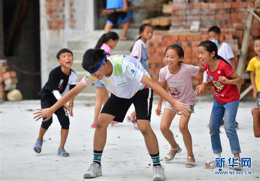 志愿者和乌英苗寨的孩子们玩“盲人摸象”游戏(8月10日摄)。 新华社记者 黄孝邦 摄