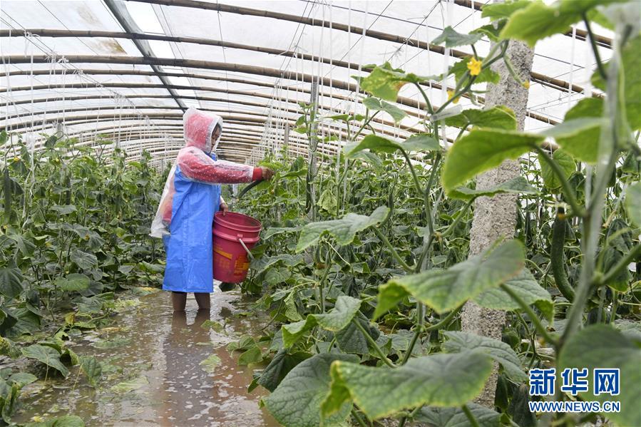 8月12日,在寿光市纪台镇尧河店子村,受灾菜农抢摘黄瓜,以降低损失。 受台风“利奇马”影响,“蔬菜之乡”山东寿光有1.8万个大棚进水受灾。目前,村民正积极排涝,降低损失,准备恢复生产。 新华社记者 郭绪雷 摄