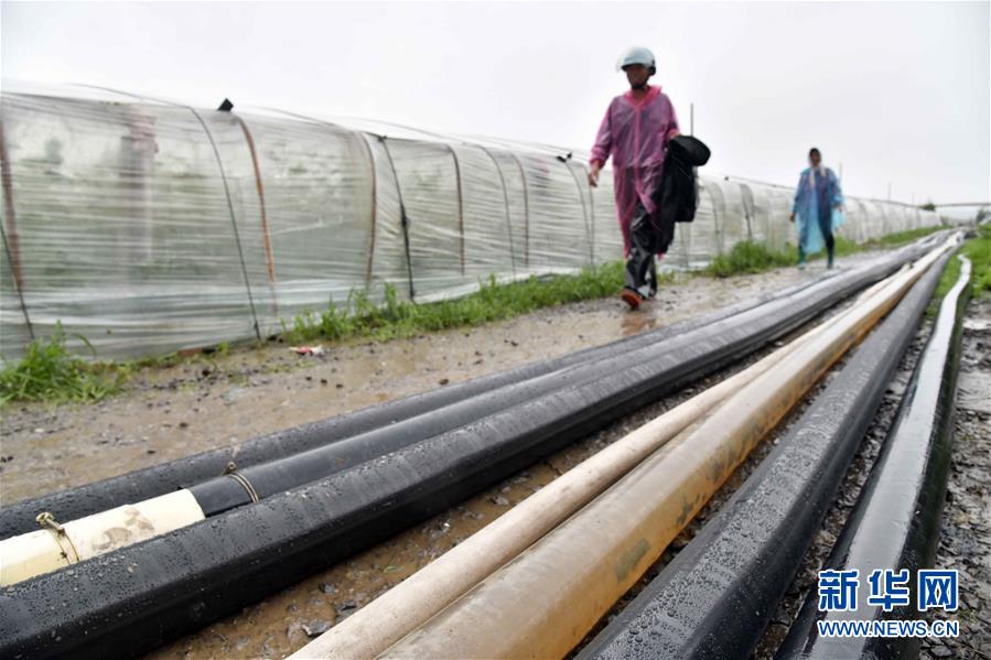 8月12日,在寿光市纪台镇尧河店子村,受灾菜农加紧排涝。 受台风“利奇马”影响,“蔬菜之乡”山东寿光有1.8万个大棚进水受灾。目前,村民正积极排涝,降低损失,准备恢复生产。 新华社记者 郭绪雷 摄