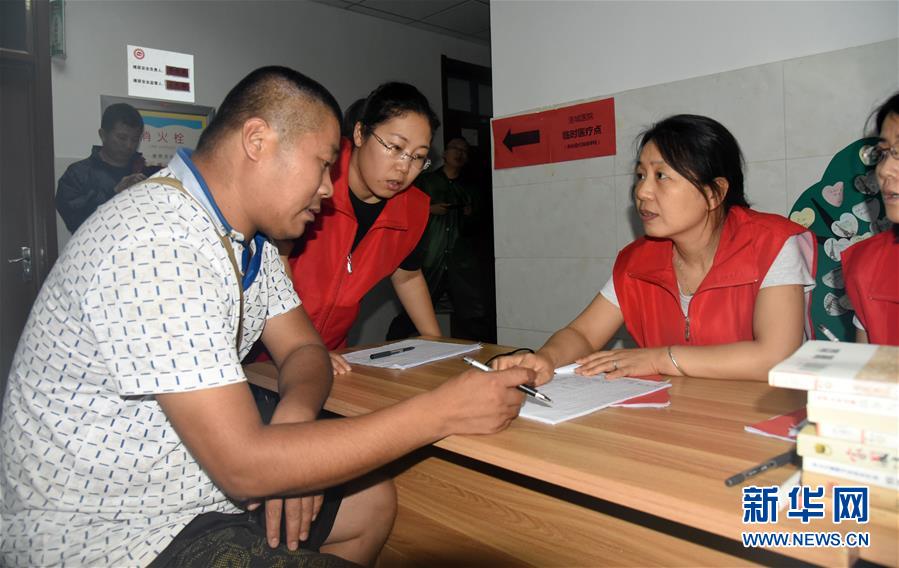8月12日,在寿光市现代双语学校安置点,志愿者为受灾安置群众解答问题。 受台风“利奇马”影响,山东省寿光市部分地区受灾严重,沿河部分村庄9.3万名群众撤离至安置点。安置点为受灾群众提供住宿、饮食、医疗等服务。 新华社记者 王凯 摄