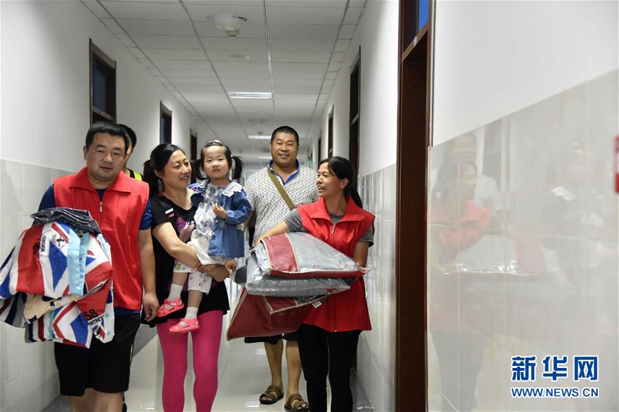 8月12日,在寿光市现代中学东校区安置点,志愿者带受灾安置群众入住。 受台风“利奇马”影响,山东省寿光市部分地区受灾严重,沿河部分村庄9.3万名群众撤离至安置点。安置点为受灾群众提供住宿、饮食、医疗等服务。 新华社记者 郭绪雷 摄