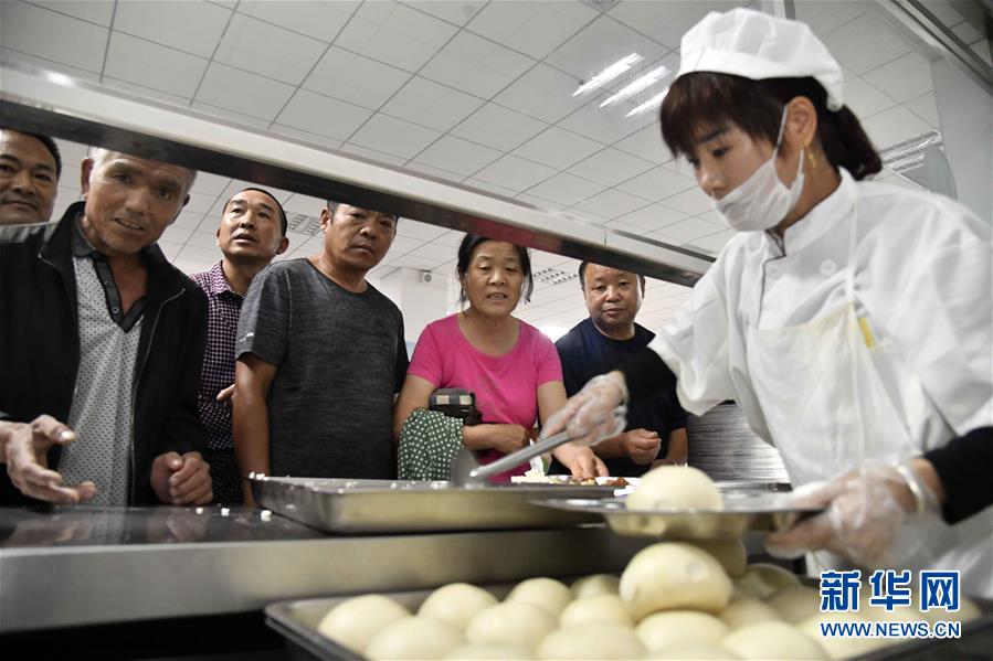 8月12日,在寿光市现代中学东校区安置点,受灾安置群众在食堂打饭。 受台风“利奇马”影响,山东省寿光市部分地区受灾严重,沿河部分村庄9.3万名群众撤离至安置点。安置点为受灾群众提供住宿、饮食、医疗等服务。 新华社记者 郭绪雷 摄