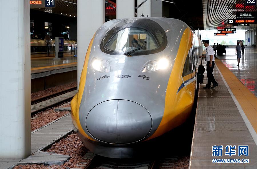 8月13日,高速综合检测列车停靠在郑州东站。 当日,郑万铁路郑州东至邓州东段正式开始联调联试,为开通运营提供重要技术保障。郑万铁路是河南省“米”字形铁路网的重要组成部分,设计时速为350公里。 新华社记者李安摄