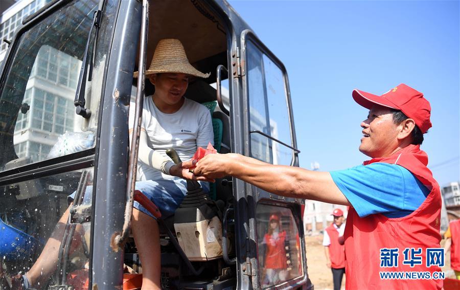 8月13日,常青街道凌大塘社区志愿者为施工人员送上西瓜。 近日,安徽合肥持续高温天气,合肥市包河区常青街道凌大塘社区的志愿者来到辖区工地,为施工人员送上西瓜、饮料、防暑药品等。 新华社记者 刘军喜 摄