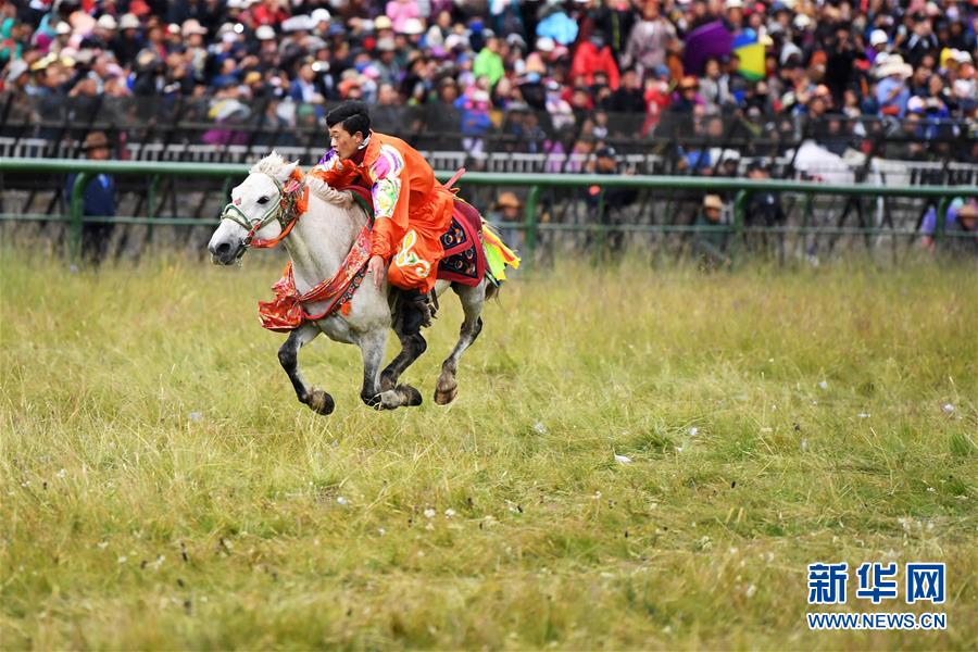 8月13日,骑手在赛马节开幕式上表演。 当日,第十二届格萨尔赛马节在甘肃省甘南藏族自治州玛曲县拉开帷幕。本届赛马节为期6天,共有来自西藏、青海、内蒙古、四川、甘肃等省区的52支队伍900多匹赛马参加速度赛和耐力赛等项目的比赛,期间还将举办草原音乐节、马术表演、民间弹唱等活动。 新华社记者 陈斌 摄