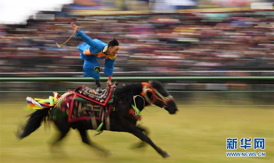 8月13日,骑手在赛马节开幕式上表演。 当日,第十二届格萨尔赛马节在甘肃省甘南藏族自治州玛曲县拉开帷幕。本届赛马节为期6天,共有来自西藏、青海、内蒙古、四川、甘肃等省区的52支队伍900多匹赛马参加速度赛和耐力赛等项目的比赛,期间还将举办草原音乐节、马术表演、民间弹唱等活动。 新华社记者 陈斌 摄