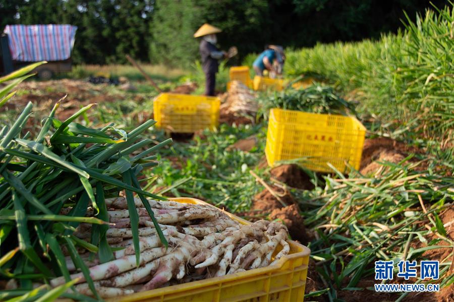 这是8月13日在湖南省江永县桃川镇社头村香姜种植基地拍摄的香姜。 眼下正是湖南省江永县香姜的收获季节。近年来,江永县采取“合作社+农户”模式,推广香姜标准化种植。2018年,全县种植香姜2万余亩,总产量5万多吨。该县打造县、乡、村三级电商网络销售江永香姜等农副产品,促进农户增收。 新华社记者 柳王敏 摄