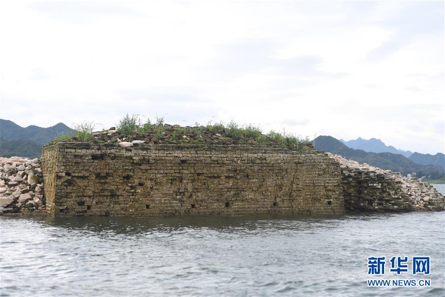 这是露出水面的“水下长城”部分城墙(8月13日摄)。日前,位于河北省宽城满族自治县境内的潘家口水库蓄水量减少,水库内一段“水下长城”再次露出水面,景色壮美。这段水下长城是明长城的遗址,20世纪70年代因建设水利枢纽工程,潘家口水库下闸蓄水,部分长城隐没水下,从而形成“水下长城”奇观。新华社记者 巩志宏 摄