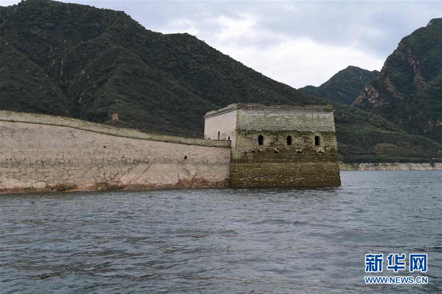 这是露出水面的“水下长城”部分城墙(8月13日摄)。日前,位于河北省宽城满族自治县境内的潘家口水库蓄水量减少,水库内一段“水下长城”再次露出水面,景色壮美。这段水下长城是明长城的遗址,20世纪70年代因建设水利枢纽工程,潘家口水库下闸蓄水,部分长城隐没水下,从而形成“水下长城”奇观。新华社记者 巩志宏 摄