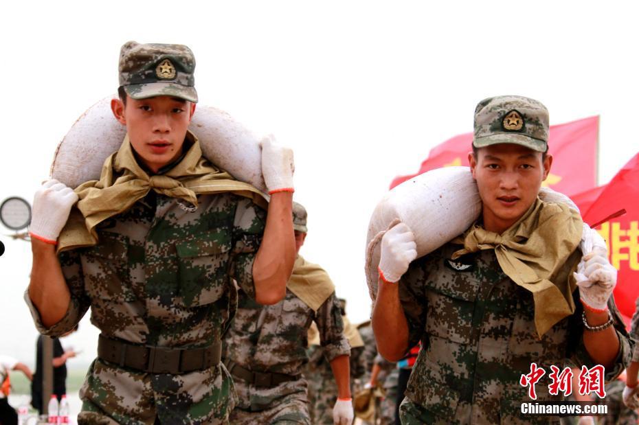 8月13日,1000余名救援人员手拿肩扛,将沙袋、木板等救援物资步行运至近一公里外的大坝决堤处。受超强台风“利奇马”影响,被誉为“中国蔬菜之乡”的山东寿光及周边县市自8月10日起普降特大暴雨,灾情较为严重。12日18时许,寿光市弥河羊口镇西堤出现缺口,千余军民共同封堵缺口,加固河堤。中新社记者 梁犇 摄