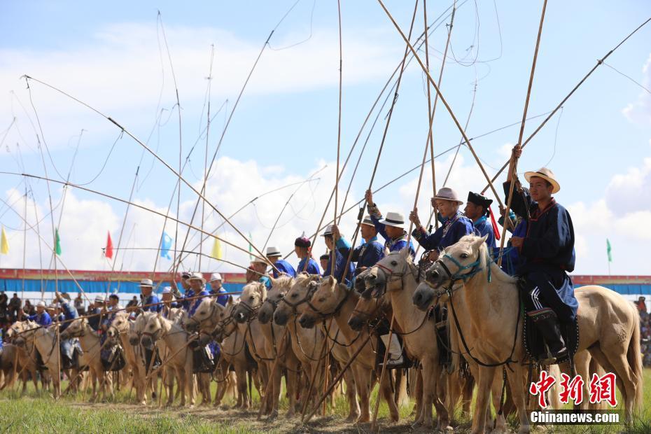 8月13日,“四季乌珠穆沁”金秋那达慕暨蒙古搏克超级联赛总决赛在内蒙古自治区东乌珠穆沁旗开幕,除了那达慕的传统项目骑马、射箭和搏克以外,还将举办东乌珠穆沁旗第九届“乌珠穆沁羊节”以及招商引资推介会等活动。图为牧民骑马手持套马杆参加那达慕。中新社发 钟欣 摄