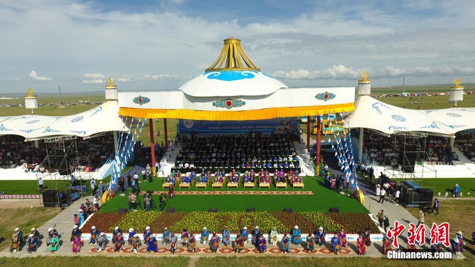 8月13日,“四季乌珠穆沁”金秋那达慕暨蒙古搏克超级联赛总决赛在内蒙古自治区东乌珠穆沁旗开幕,除了那达慕的传统项目骑马、射箭和搏克以外,还将举办东乌珠穆沁旗第九届“乌珠穆沁羊节”以及招商引资推介会等活动。图为航拍那达慕开幕式现场。中新社发 钟欣 摄