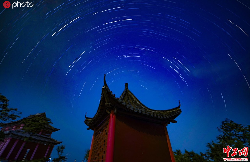 2019年8月11日凌晨,江西省新余市仰天岗国家森林公园内多重曝光下的星轨图和英仙座流星呈现出别样的风景。图片署名: 签约摄影师/IC photo