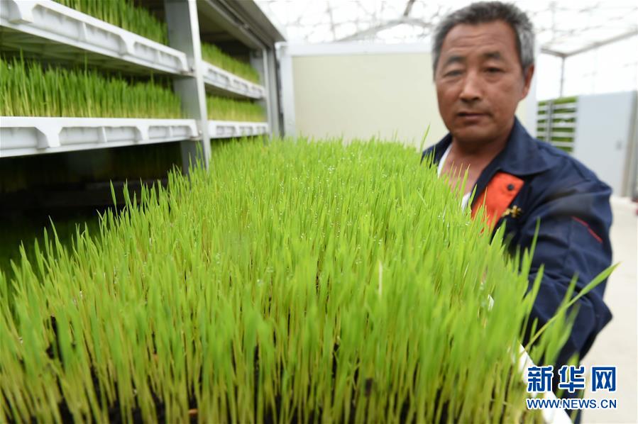 在黑龙江省抚远市玖成水稻种植专业合作社的快速育秧车间,一名社员在展示通过科技设备快速培育的秧苗(2016年5月24日摄)。 新华社记者 王建威 摄