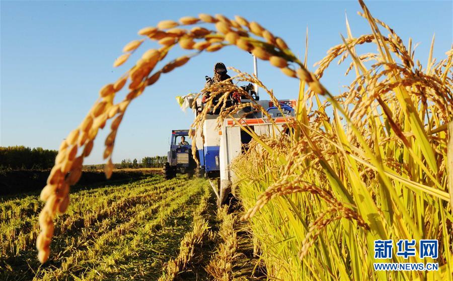在黑龙江省垦区,村民驾驶收割机收获水稻(2011年9月24日摄)。 新华社记者 王建威 摄