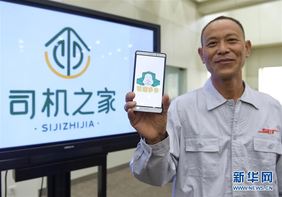 8月14日,上海交运集团股份有限公司下属机场物流中心驾驶员孙拥军在展示 “司机之家”微信表情包图案。 新华社记者 李贺 摄